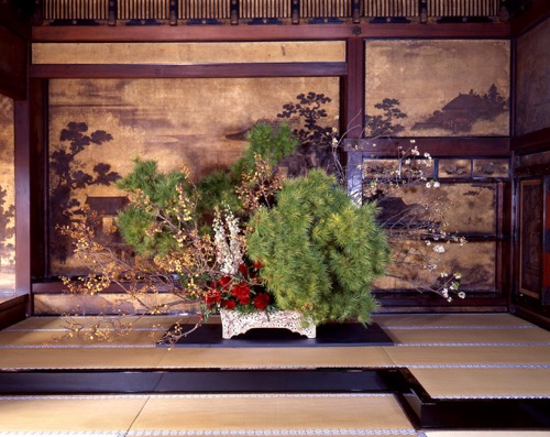 Her work invites viewers into a different dimension beyond time and space, using massive pine and princess trees suitable for the magnificent Japanese room together with bright-colored Chinese peonies at the bottom .