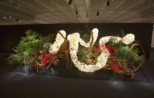 This work emitted an overwhelming sense of the vitality of flowers and trees encountered upon going through the "Waves of Beginning," a tunnel made of 60,000 paper-thin sheets of wood! Her work, which sought to make visitors experience ikebana with all five senses, generated huge excitement.