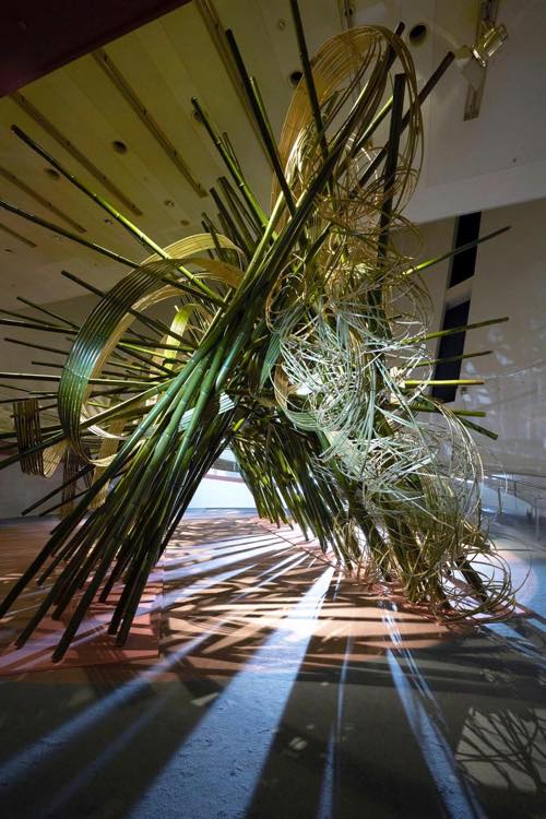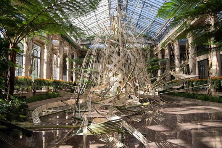 Longwood Gardens, situated in the suburbs of Philadelphia, USA, is known as one of the most beautiful gardens in the world. The collaborative project was a long-held wish for both Sogetsu school and Longwood gardens and finally was realised in 2019. This work, entitled Kodo (pulse), had a total length of about 8 m (26 ft.), making it one of the Iemoto's largest ever works. The Iemoto says, "I expressed the birth of unknown life with intricate bamboo swells." The work integrated with the beauty of the gardens was admired and praised for its graceful and dynamic expression. Sogetsu Atelier staff from Japan, Longwood Garden staff, and the members of local Sogetsu groups worked together for two weeks to create this splendid installation.