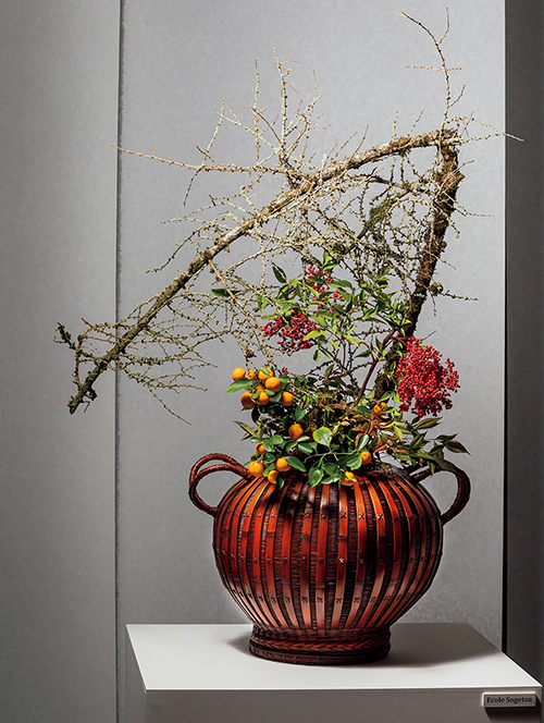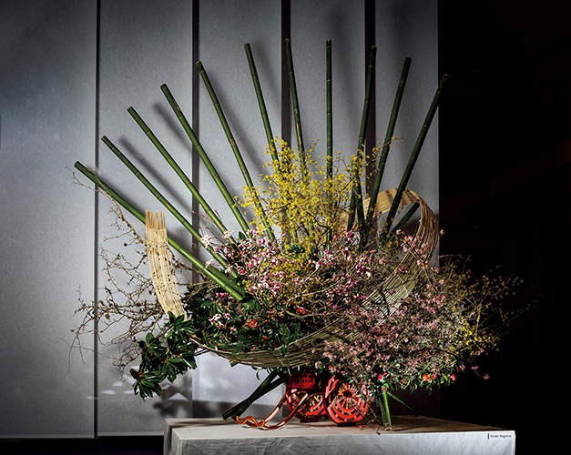 "Japonismes 2018: Souls in Resonance" was held in Paris, France from 2018 to 2019 to commemorate the 160th anniversary of friendship between France and Japan. In the official program "Ikebana Floral Art", the Iemotos and the designated successor Iemotos of the five different ikebana schools—Ikenobo, Ichiyo, Ohara, Misho and Sogetsu—got together to hold a joint exhibition, the first of such event in the long history of Ikebana. In this large Iemoto's work on a Japanese ancient period court carriage , the contrast between the straight and curved lines of round and split bamboos create a striking beauty with early spring flowering branches.