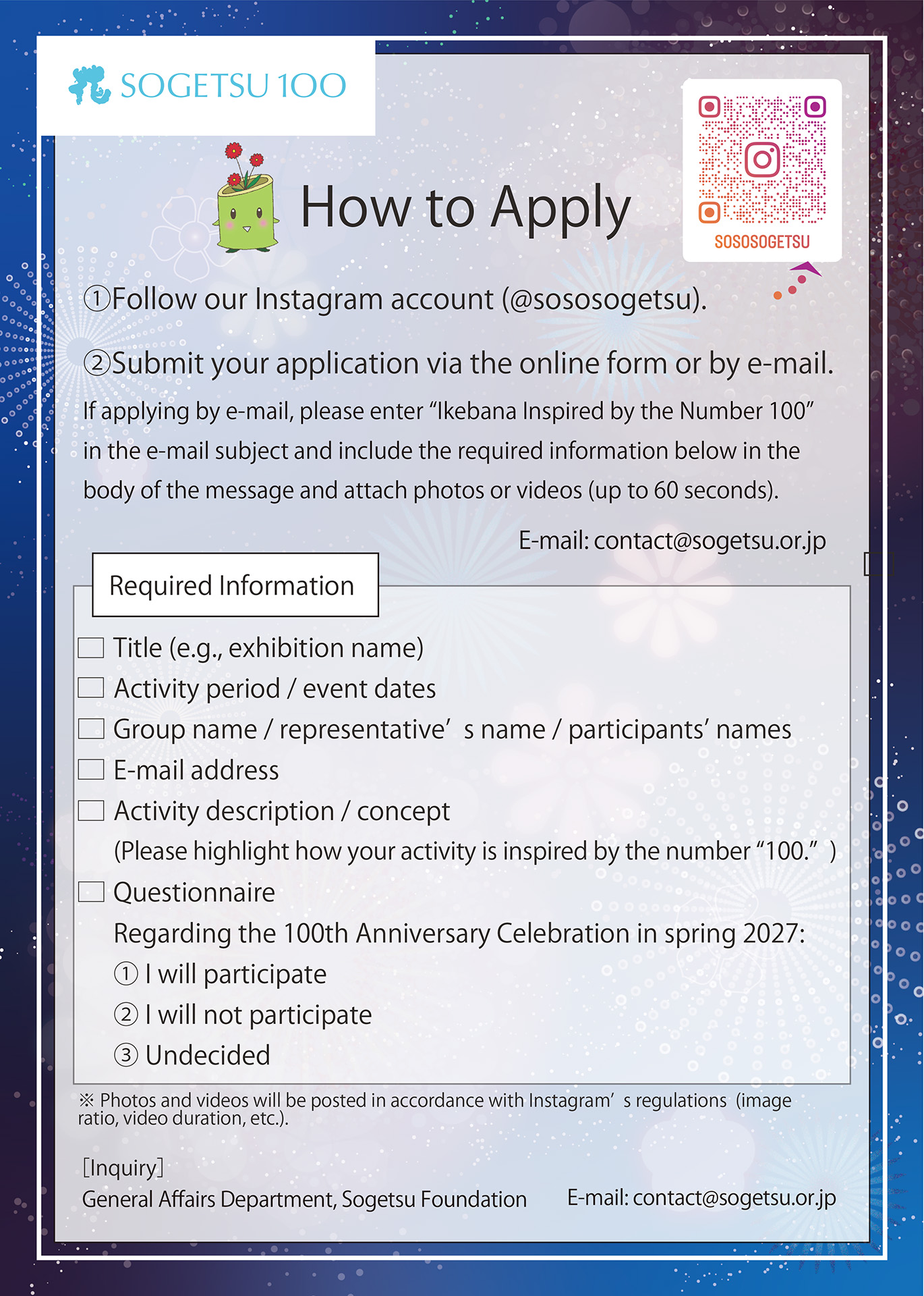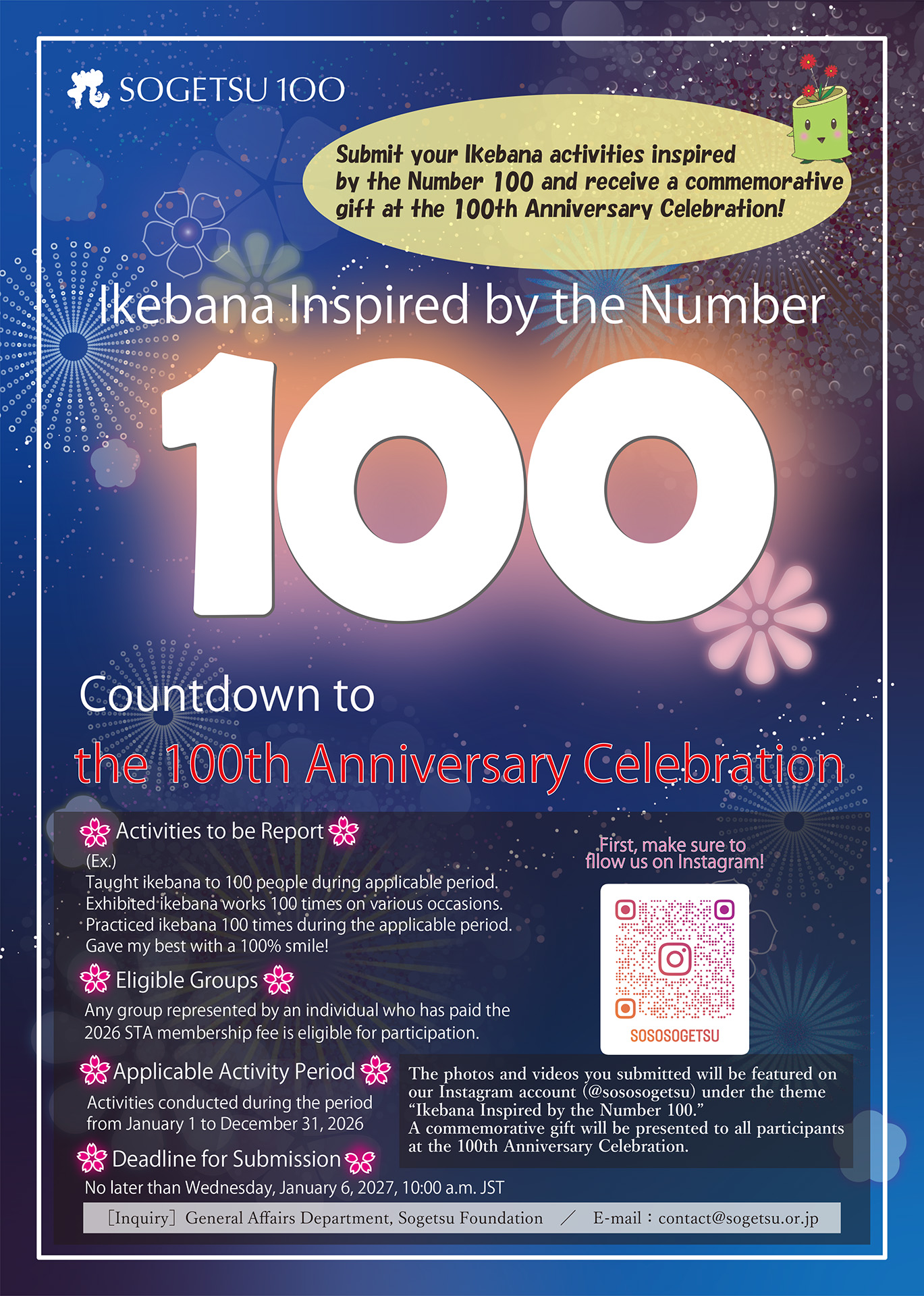 Selected photos and videos will be featured on the official Sogetsu Instagram(@sososogetsu)under the series “Ikebana Inspired by the Number 100”. Additionally, participants will receive a commemorative gift at the 100th Anniversary Celebration in 2027.