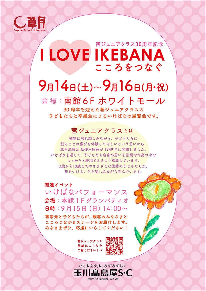 Celebrating the 30th year of Akane Junior Class, an ikebana exhibition by the students titled, “I LOVE IKEBANA: Binding hearts together” will be held at the Tamagawa Takashimaya Shopping Center.