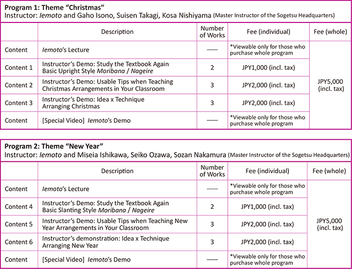 This is a new ikebana learning style for teachers, in which the lectures of the Iemoto and the Master Instructors of the Sogetsu Headquarters can be viewed on the Internet. During the streaming period(1st of December to 31st to January), you can watch it as many times as you like at any time. Please try it!