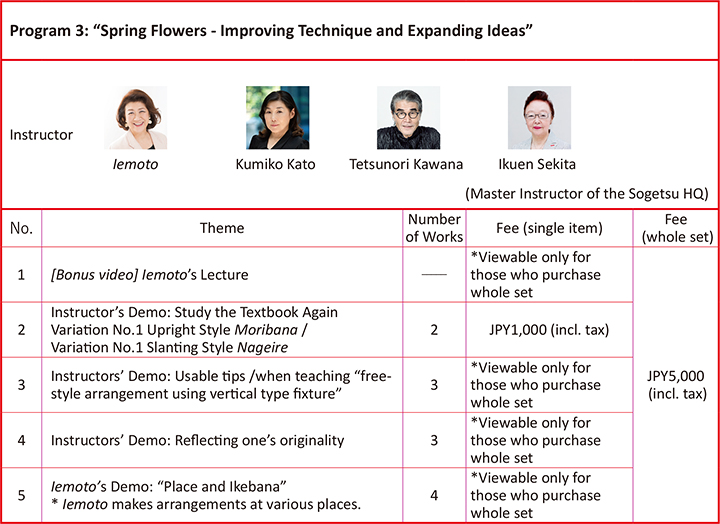This is a new ikebana learning style for teachers, in which the lectures of the Iemoto and the Master Instructors of the Sogetsu Headquarters can be viewed online.