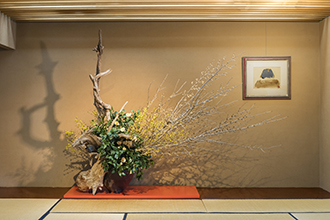 In the Japanese room on the fifth floor of the Sogetsu Kaikan, seasonal ikebana works are constantly on display for public view.