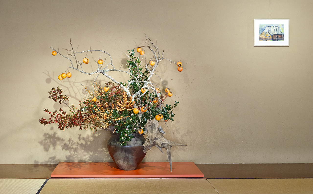 A majestic Japanese persimmon branch, still draped in moss, was elegantly paired with several pieces of driftwood to form the core structure of the arrangement. Winterberry branches, adorned with strikingly colored orange fruit, were used in place of flowers, providing an exquisite contrast to the backdrop of autumn-colored azaleas. At the base of the large vase, white sasanqua camellias were artfully arranged to complete the composition.