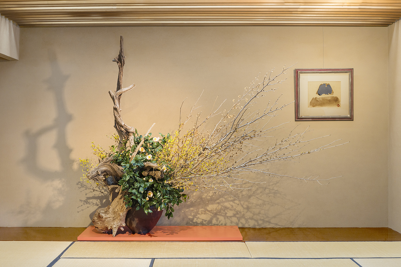In the Japanese room on the fifth floor of the Sogetsu Kaikan, seasonal ikebana works are constantly on display for public view.