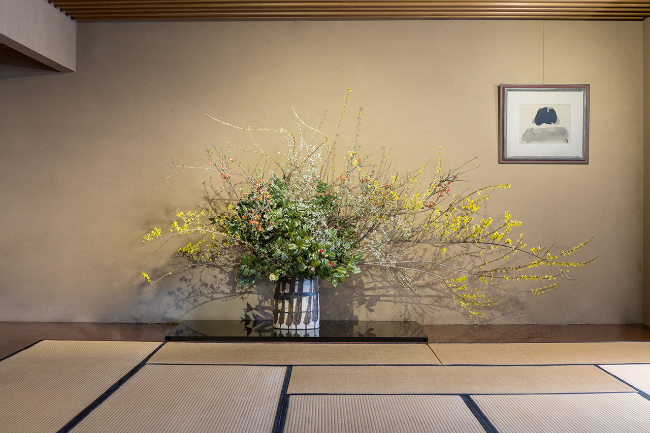 In the Japanese room on the fifth floor of the Sogetsu Kaikan, seasonal ikebana works are constantly on display for public view.