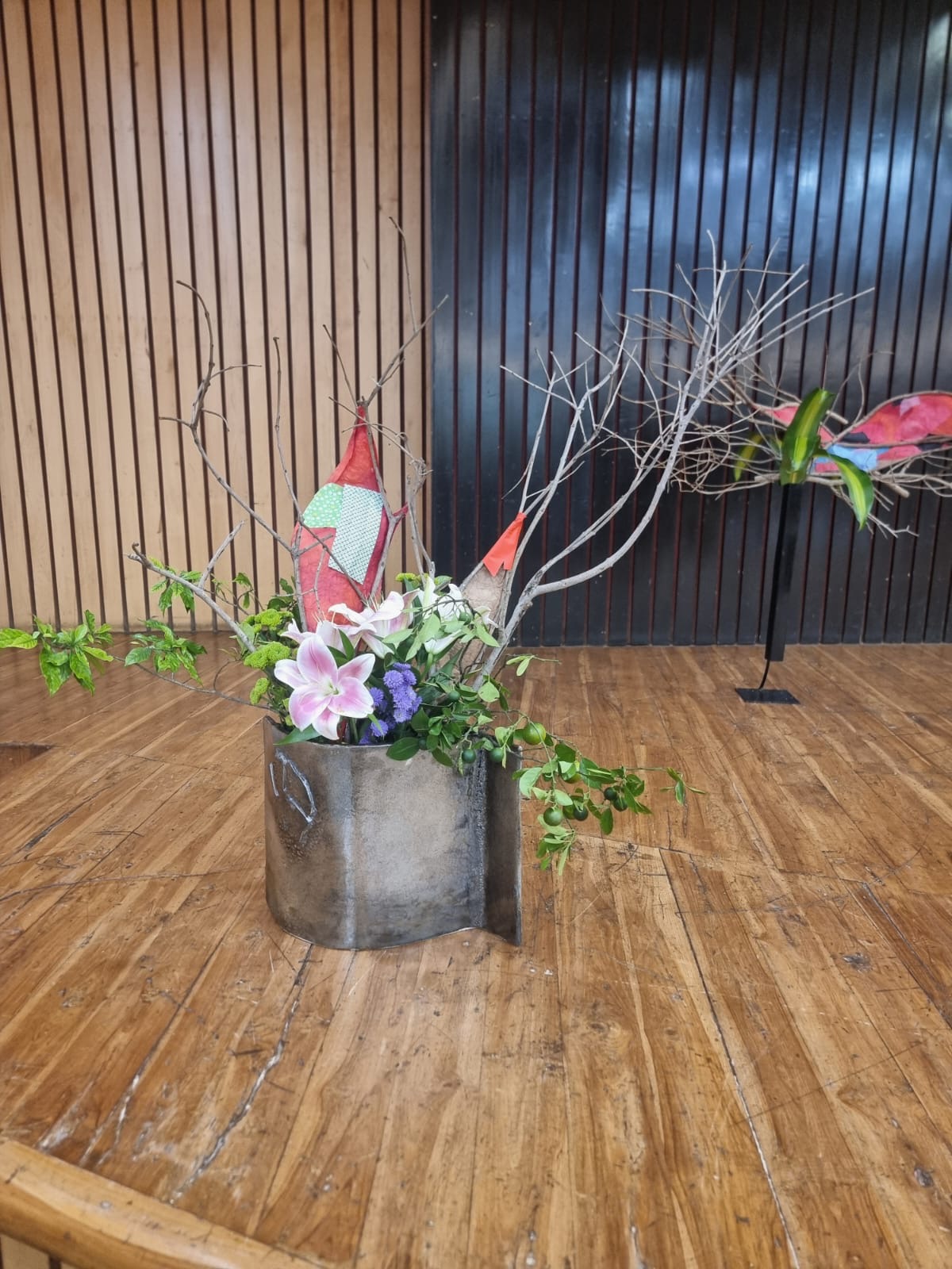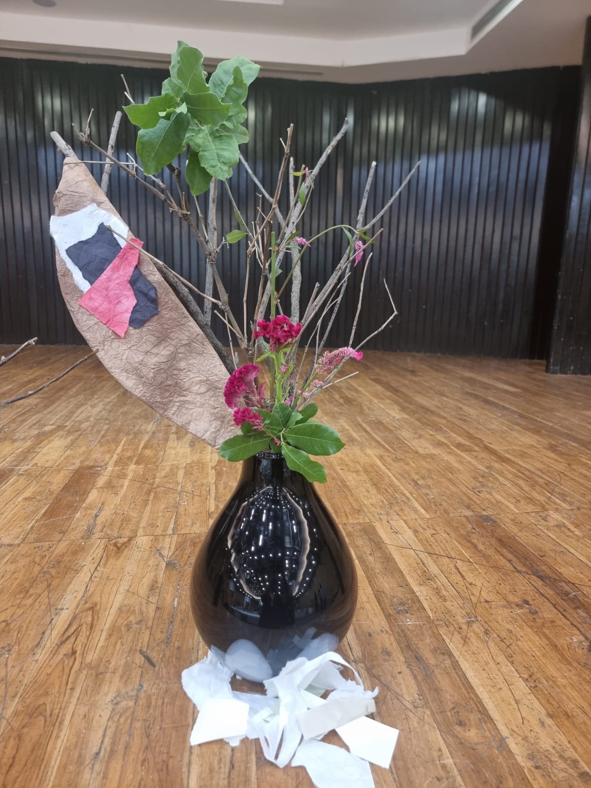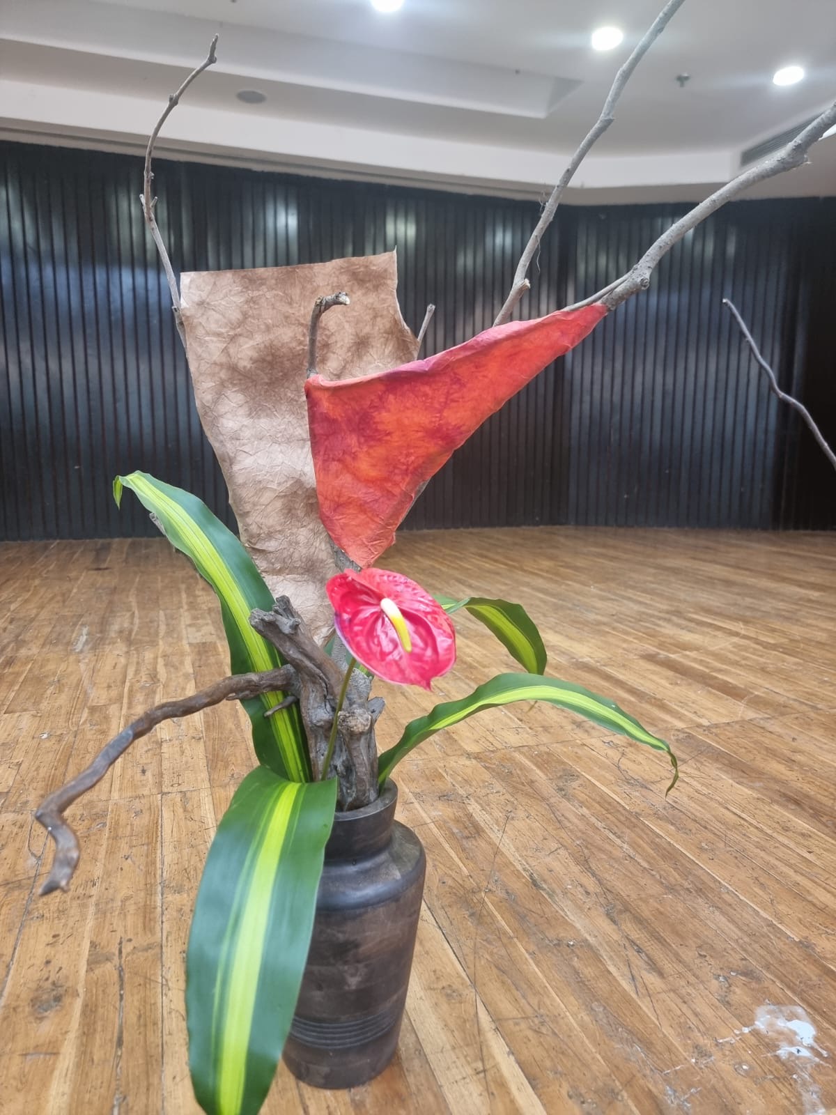 It was a very innovative and educative workshop as the members here had never used paper to cover space and create a different look to the dried branches. The Members were very enthusiastic and tried to create various Ikebana. They used the greens and the flowers which were provided to them to enhance the arrangement.