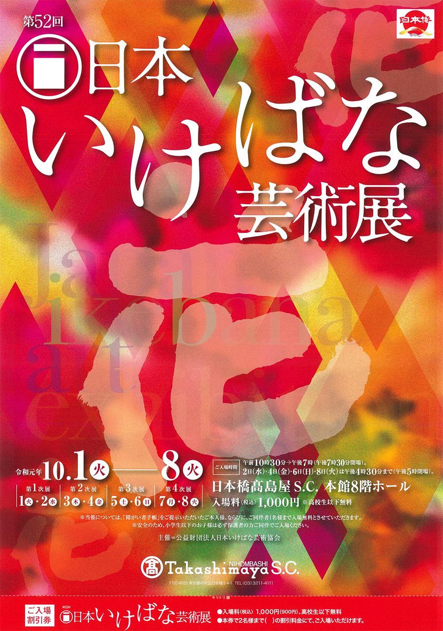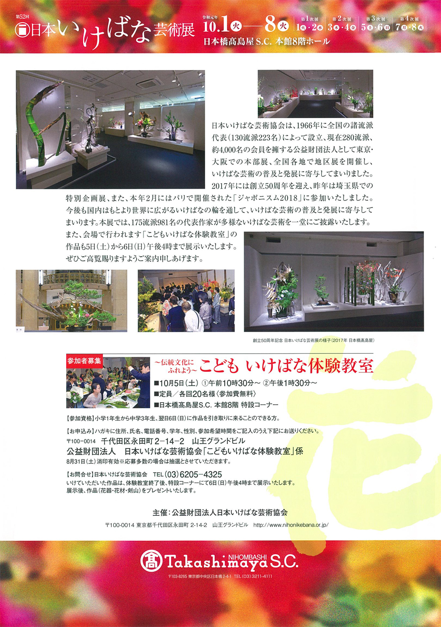 The 52nd Japan Ikebana Art Exhibition will be held at Nihonbashi Takashimaya S.C. 8th Floor Hall. This time, 981 representative artists from 175 schools are planning to exhibit, and many artists from the Sogetsu school will also participate, including the exhibition of Iemoto Akane Teshigahara.
