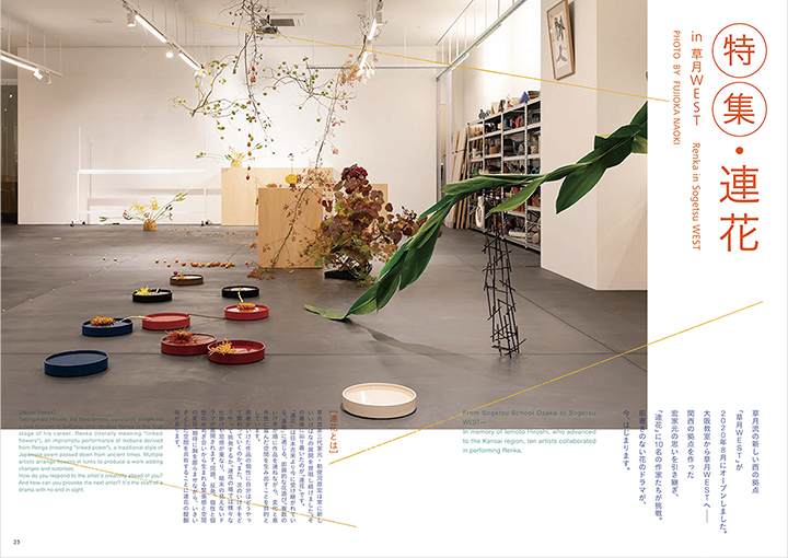 The second is an interview with Mrs. Miyuki Tamura, the proprietor of Sasaya Iori, a maker of Japanese confectionery with a history of over 300 years. It has a trendy shop next to Sogetsu WEST. The third is about our ten ikebanists’ challenge of ‘Renka’ at Sogetsu WEST, which is a game of flower arrangement Hiroshi Teshigahara, the former Iemoto practiced. Please have fun with these interesting projects that can only be done in Kyoto.