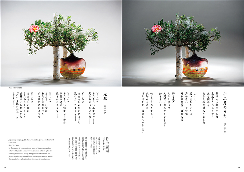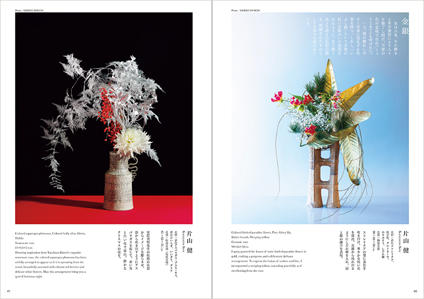 Winter is a season marked by lively, celebratory colors. Gold and silver, red and white, pine, bamboo, and citrus……. These traditional auspicious items have been gifted for generations along with the heartfelt wish, “May good fortune come to the recipient.” Brightly and spontaneously, Sogetsu ikebanists convey their diverse wishes through the art of ikebana for joy.