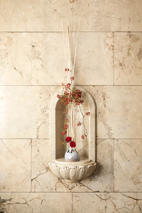 On the remains of the water fountain at the side of the main entrance of the Nihombashi Takashimaya S.C., which is the first important cultural property as the department store architecture. It's a work arranged against the beautiful marble wall, from which we could feel its history, and the sweet Chinese roots were arranged as if they were dancing.