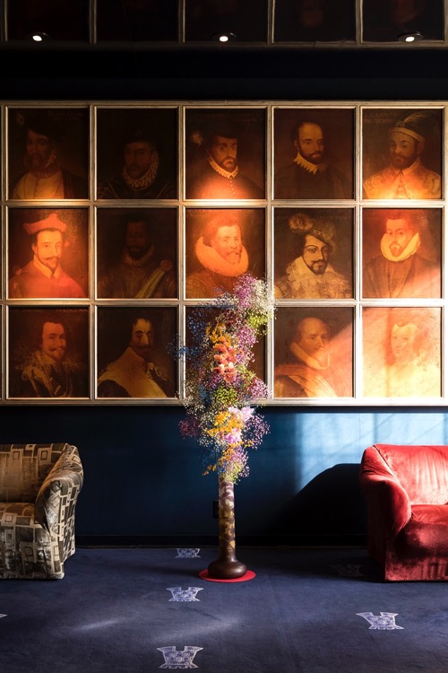 In the bar lounge of Tour d'Argent Tokyo. A glass vase made by Émile Gallé was selected for a rich and dense space, and materials in softly melting colors were arranged.