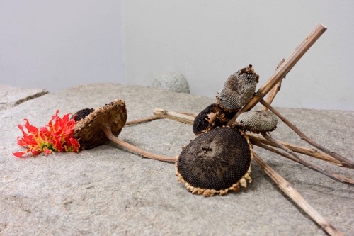Isamu Noguchi's stone garden "Heaven" has various stone textures. Dried sunflowers, which are also very expressive, were used and the red of the glory lily was added as an accent here.