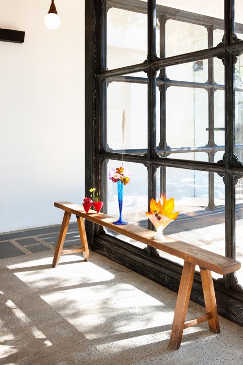 Glass vases were placed on a bench that sits in the full sunlight, and these works were arranged enjoying their colors and shapes. As the first Iemoto Sofu wrote, "In addition to the colors of flowers, pay attention to the containers, pedestals, walls and lights." in The Fifty Principles of Sogetsu, lighting is also a very important element.