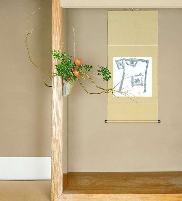 秋を代表する花材のひとつで、最も小ぶりな柿の「豆柿」を用いました。豆柿の直線的で潔い枝ぶりに、しだれぐわのしなやかな曲線を合わせ、線が奏でるリズムと面白さを表現しています。足元にはマッスの要素を持つアナベルとあせびを添え、線と塊の響き合いによる構成としました。初代家元・蒼風による富士の絵と共に、日本の秋の風情を感じていただければ幸いです。