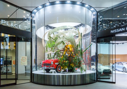 銀座四丁目交差点に面したシリンダーへ展示された「フェアレディ SPL213」に家元が公開で花をいけ、華やかな花車は道行く人の注目の的となりました。