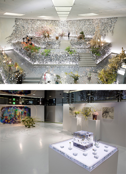 石庭『天国』を、ステンレス板からなる「鏡のツタ」で覆った会場構成は、佐藤オオキ氏率いるデザインオフィスnendo + 空間デザインオフィスonndoが手がけ、デザインアワードにて各賞を受賞。家元による生命力溢れる瑞々しい花とともに、まさに煌めく異空間となった石庭は、本展の最大の見どころとなりました。